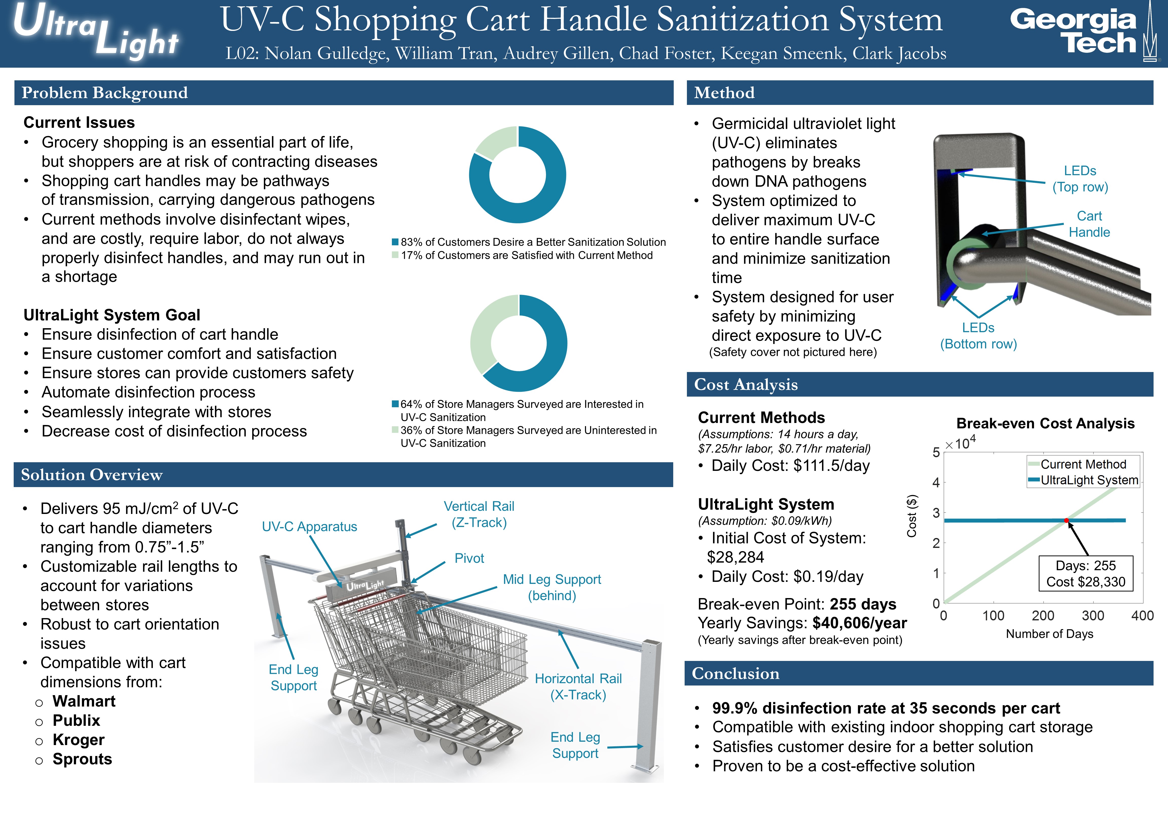 Project Description: During the peaks of the COVID pandemic, everyone was doing their best to isolate and stay at home, but there was one place where everyone had to go out of necessity, the grocery store. A shopping cart handle will be touched repeatedly throughout the day and inevitably becomes a commonly contacted surface. To reduce the spread of pathogens in grocery stores, the UV-C Shopping Cart Handle Sanitization System was created. Instead of relying on workers and sanitization wipes, this automated system will guarantee a 99.9% disinfection rate in 35 seconds. MATLAB was utilized to optimize UV-C LEDs and Solidworks for FEA structural analysis of the system.